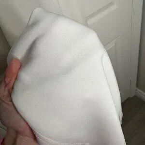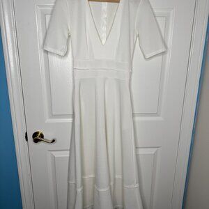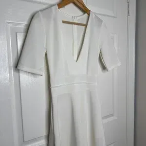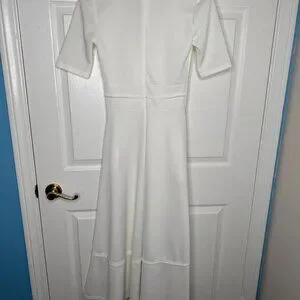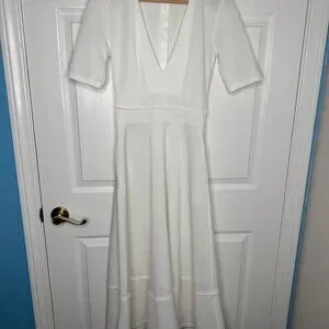 White deep v neck maxi dress, size S, 26" waist. No brand, no tags. A little sheer. Has pockets. There are a couple little spots on the skirt as shown. First is on the back, second is on the front hem. $40 + shipping.
