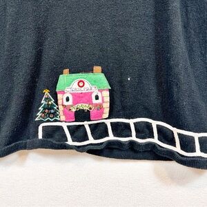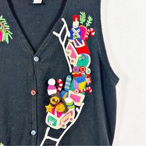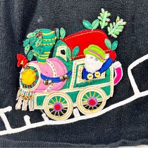 Beautiful embroidered knit cardigan depicting Santa's workshop North Pole train with christmas toys. Woven buttons, bauble detail.
