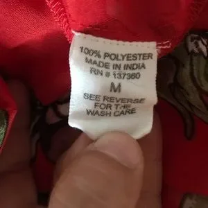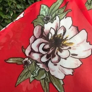 Feminine, flowey boho-style kimono. Gorgeous vivid tomato-red with splashy florals throughout. No stretch; great over shorts, denim, or as swimsuit cover-up!