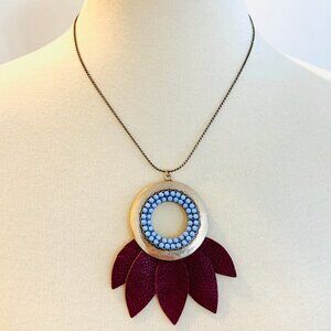 New without tags. Fabulous gold circle pendant with periwinkle stones and burgundy leather feather accents. Simple chain is adjustable up to 29".