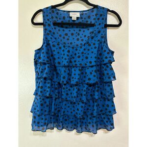 LOFT by Ann Taylor Women's Polka Dot Blouse With Ruffles Petite SZ M Black/Blue. Good pre-owned condition, no rips, tears, or stains.