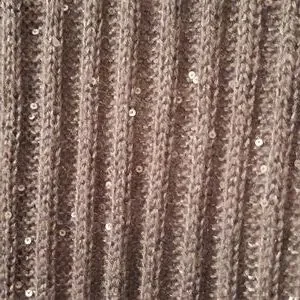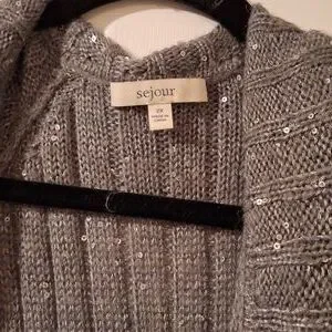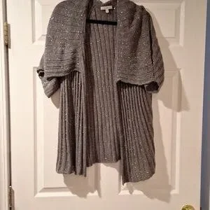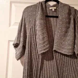 Silvery gray short sleeve sweater with sequins. has one hook closure. very cute worn about 3 times bought at Nordstrom. measures approx 26 inches from armpit to armpit. but has stretch. length measures approx 28 inches from back of neck to hem.