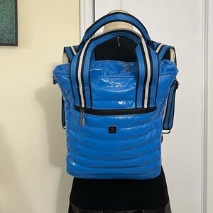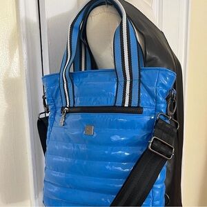 Outside pockets on tote bag include: Back slip pocket and front zip pocket