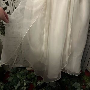 GIRLS RARE EDITIONS Gorgeous ivory & white sleeveless formal flower girl dress, absolutely adorable for lots of occasions, top is silky ivory with little white flowers, chiffon style overlay with satin underlay, cute little flowers at waist (could remove blue flowers), sweet chiffon waist tie up sash, zipper in back, very mild discoloration at pits & along hem, great condition, no snags tears or discoloration, see all pics per additional description, flat approx measurements (girls/16) (avg bust 30/32) (pit to pit 15”) (waist 30”) (length 43”)