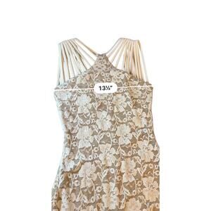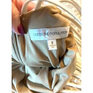 This ivory lace dress from Dress the Population is stunning! It features multiple straps for your shoulders, a hidden back zipper and a kick pleat opening in the back. The bodycon style will fit you in all the right places. This 100% made in the USA dress is fully lined with a nude lining made of 93% Polyester/ 7% Spandex. It is topped with a fabulous ivory floral lace made of 90% Polyester/ 10% Spandex. There is a small hole in the lace that is barely noticeable but see the pictures for detail. This lovely dress will be quickly shipped with care from a smoke free and pet free environment. Please note, colors and measurements may vary slightly due to differences in lighting, screen resolution, and position.