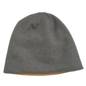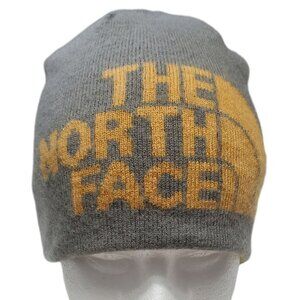 The North Face Beanie Hat Wool Blend Orange Grey Knit Logo Spell Out Winter Cap