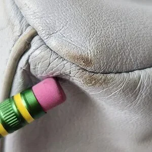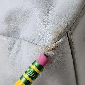 Good used condition - all 4 corners on the bottom have marks, please see the detail photo. Slight discoloration on the front pocket.