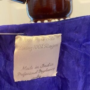 Royal blue and silver outlined with pearls sequin dress. Fully lined, long sleeve. Side slit detail at hemline. Lining is 100% rayon dress is 100% silk. Bag with extra sequins. Padded shoulders. Pull on styling. Measurements taken lying flat non-stretched