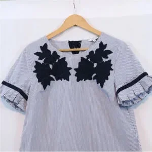 Crown & Ivy striped top with velvet trim around pleated ruffle short sleeves, velvet floral embroidery and velvet keyhole tie on back of neckline. Great Condition.