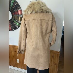 Faux suede and faux fur collar coat is New with Tags. Size Small. Approximate measurements Pit to Pit 19 inches Length shoulder to hem 30 inches. Coat is double breasted gold tone snaps. Removable faux fur collar. Belted cuffs and front pockets are trimmed in faux leather.