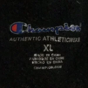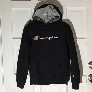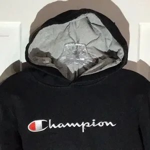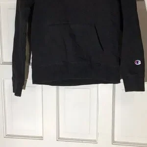 Stylish black hoodie by Champion. Features a front pocket and hood. Perfect for casual wear.