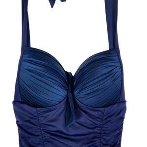 Retro glam! This classic one piece features flattering ruched front to flatter and slim the torso, cute bow detail, fixed molded cup for shape and support, and a lovely soft & wide halter strap for adjustable comfort.