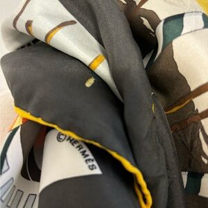 Beautifully classic authentic Hermes scarf designed in 1996. Rich colors with black border. Pure silk. Made in France.