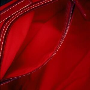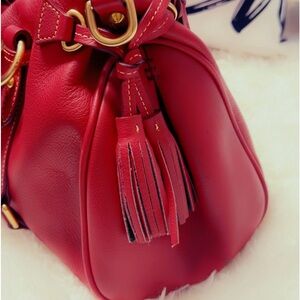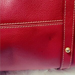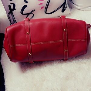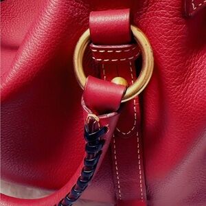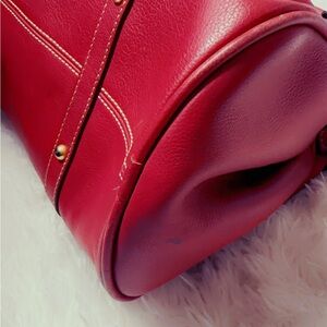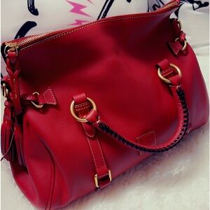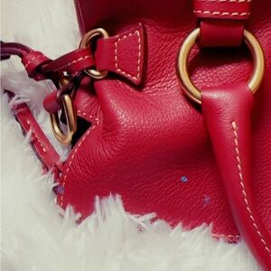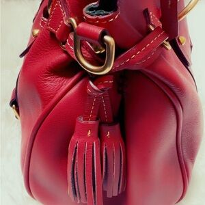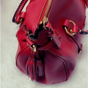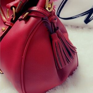 Dooney & Bourke Florentine 15" Satchel in Raspberry pink. Formerly called Medium, they now call it Large—adjustable, detachable strap. Gold-tone hardware. Feet on the bottom. Interior lined in red cotton. Back wall zip and slip pockets. Front wall slip pocket. Attached is the key leash. Shows light use inside and out—excellent, clean condition.