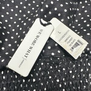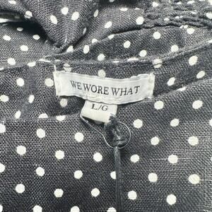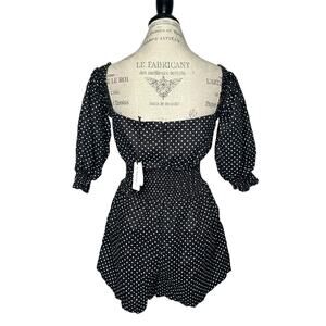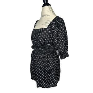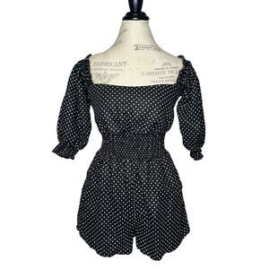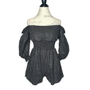New with tags women’s WeWoreWhat 100% linen black polka dot short romper featuring two side seam pockets, square neckline, smocked waist and cuffs, back zipper closure, and balloon sleeves. Can be worn off shoulder for a more casual and fun look.