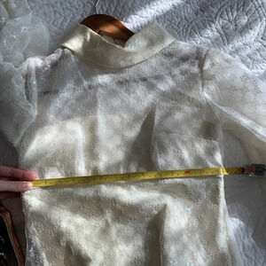 Vintage gently used beautiful 1960s wedding dress. Handmade dress, comes with original pattern with pamphlets inside. Labeled a vintage 8, but measurements appear to fit a size 0 according to the size chart. Pit to pit measurement included in images, length is in the image as well. Just measured to the lining, train extends longer. Sheer balloon sleeves, floral patterned textured material, shines iridescent in the sunlight. Clasps and zips in the back. Does have some light dirt/small signs of wear at the bottom. Ivory color.