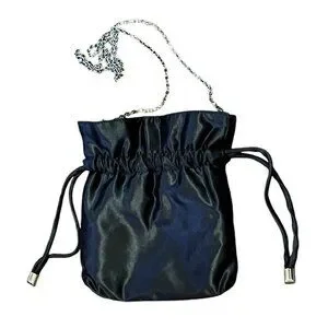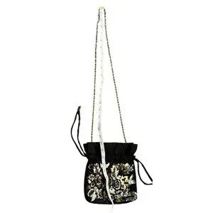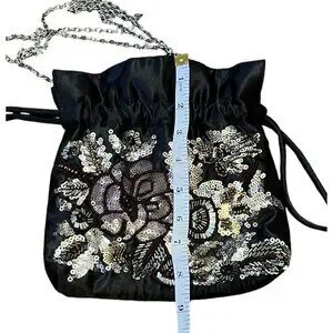 Add some sparkle to your evening attire with this vintage Jessica McClintock shoulder bag. The black fabric exterior is adorned with a beaded floral pattern and sequins, making it the perfect accessory for formal occasions. The bag features a drawstring closure and a chain strap for easy carrying.