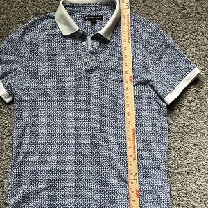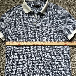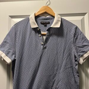 The color and end of the sleeves are white, with a blue and white pattern run along the body of the polo.