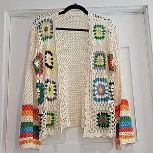 New Boho crochet bell-sleeve Granny squares open front sweater. Oversized S Square colors may vary from model.