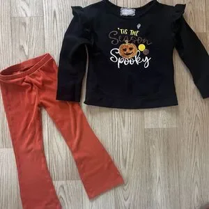 Girls 5T Halloween Outfit Orange Black Flare Pants Cozy Pumpkin Shirt