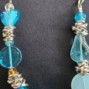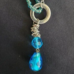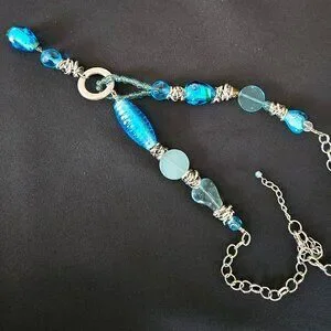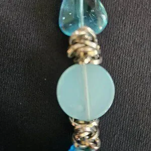 This is a beautiful, rare and one of a kind find. Various shapes and sizes of translucent aqua blue glass beads are integrated with metal spacers. The necklace, including chain with lobster claw, is 13" long with a 1 1/8" extender. This unique necklace is in excellent vintage condition.