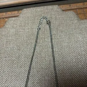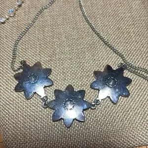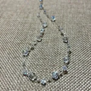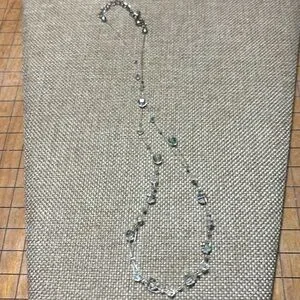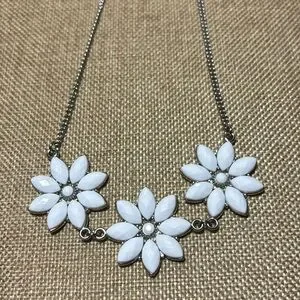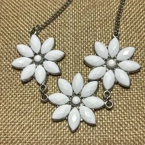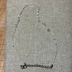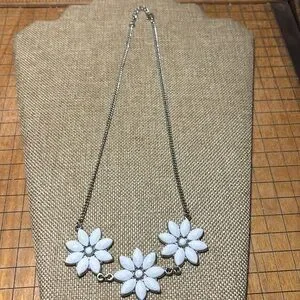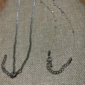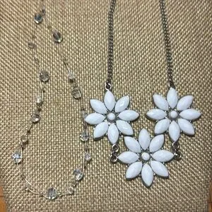 Excellent used condition. White faux crystal piece measures 22”L and the floating crystal bead item measures about 18”L. Both are adjustable. Heavier flower shaped design necklace has the feel of J Crew. The other piece has a light sparkle from the iridescent faceted beads suspended on a couple, barely visible strands. They are not tied and can be moved on the strand to tweak the location.