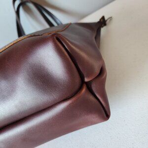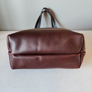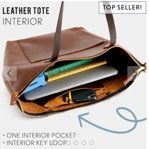 "LIKE NEW" Amazing Looking Dark Brown/Cognac Leather Tote By Portland Leather. Sturdy English Bridle Dual Top Handles, Zip Top Closure, Large Front Slip Pocket, Antiqued Brass Rivets, Raw Leather Interior with Large Leather Slip Pocket & Handy Leather Key Loop, Bag Measures approx. 12" Tall X 15" Wide at Top / 11.5" Across Bottom X 5" Deep, Like New Condition, No Wearing/Corners/Stains, Minor Markings Normal (look of bag), Used Once:) Rt.180.00 approx. * Great Travel /Work Bag!