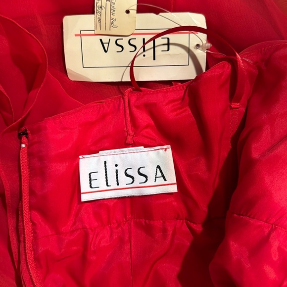 Vintage red chiffon formal gown withh sash and rhinestone broach by Elissa. New, never worn, tags in tact. Condition is like new, as pictured. Please note this is truly vintage—this is labled size 6 but is a modern day 0/2—this is too small for the mannequin.