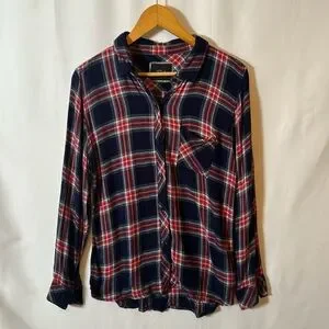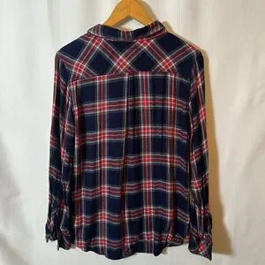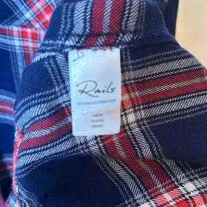 This cozy Rails flannel in size large is the perfect go-to for fall and winter! Featuring a timeless navy, red, and cream tartan print, it offers a relaxed fit with a slightly longer back for extra coverage or easy tucking. Navy buttons down the front and at the sleeves (no securing tabs for rolled sleeves) add to its laid-back vibe.