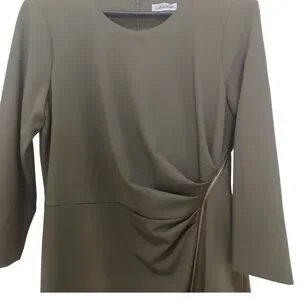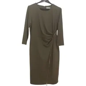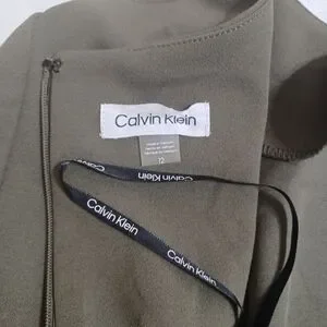 Calvin Klein Scuba Crepe Dress featuring Ruching Waist Detail. Constructed from a polyester-spandex blend, this modern design showcases a short length with a contemporary neck style. The short sleeve silhouette wraps elegantly at knee-length. Dry clean only.