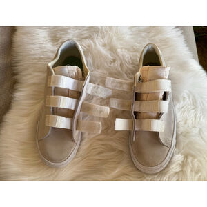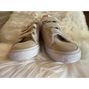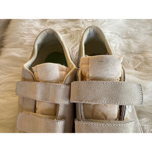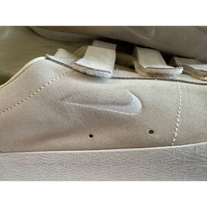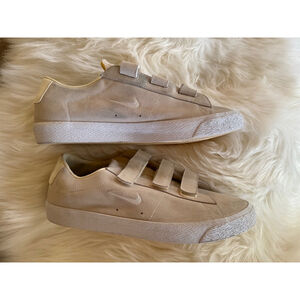 Crafted with a sleek upper Sail-white, aka light beige suede. Features three hook-and-loop Velcro straps closure ensuring a secure fit every time. The shoes show signs of wear, including minor scuffs and discoloration on the suede. The white midsole exhibits some discoloration and minor wear. Does not come with insoles. The Nike SB branding is visible on the tongue and heel. Overall, the shoes are in good condition with visible signs of previous light use.