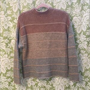 Stay warm and stylish with this ombre striped sweater. Perfect for any casual occasion. Cozy sweater tee in shades of light rust, oatmeal, and gray. Mock neck, long sleeves, boxy fit.