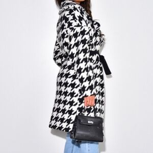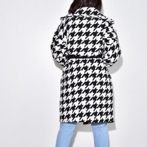 Stylish black and white houndstooth coat. Features a belted waist. Perfect for a fashionable look.