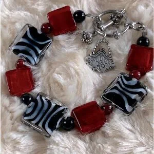 Art Deco Red & Zebra Striped Glass Bead Toggle Bracelet
