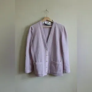 Vintage 1970s Castleberry cardigan sweater in lavender purple dacron polyester knit with textured almost stiff feeling knit, v-neckline, buttons down the front, long sleeves, straight fit, patch pockets, and slightly longer hip length.