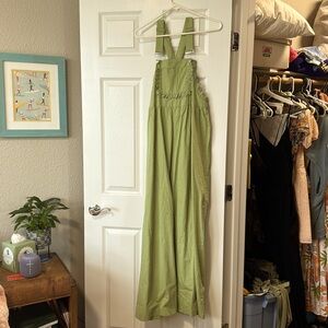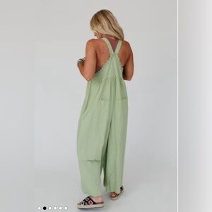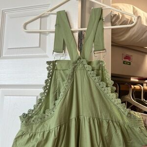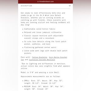 I love lace details making it unique! Great versatile sage color for all seasons. It’s wider leg than I expected, it runs large, so a small would have been a better fit for me. I’m 5’5” (length is fine, worn with cowgirl boots) but you can adjust The straps as needed. There is only 1 left on the site as of 11/23/24 will be gone soon!