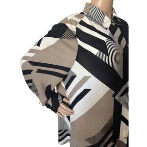 This blouse offers a sophisticated geometric design, suitable for both professional environments and stylish outings. The button-up closure and long sleeves enhance its elegance, while the neutral color palette allows for versatile pairing.