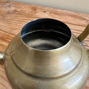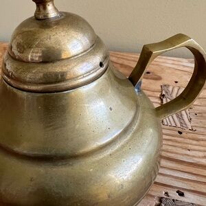 Solid Brass Tea Pot with lid and handle. Perfect for a Country Farmhouse Rustic decor style. It measures approximately 5” tall with lid x 6.25” wide including handle and spout.