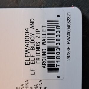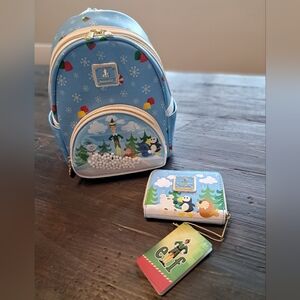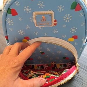 New with tags Loungefly Elf backpack and matching wallet. Darling detailed pattern. Moving soft "snowballs" in the front pouch. Perfect for an adorable fun Christmas gift. Perfect brand new condition.