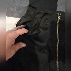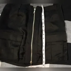 Great condition. Size small. Black in color. Zipper detailing. Pockets on side and on front of skirt. Very silky feeling. Measurements and fabric content listed above in pictures.