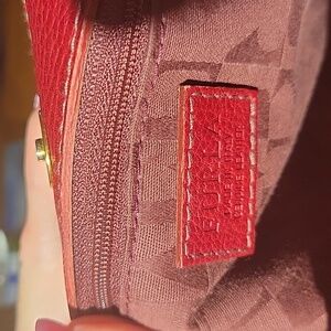 A vibrant cranberry red leather tote handbag with a wide, rectangular shape and two sturdy beautiful woven handles for versatile carrying options. Soft, buttery leather with minor imperfections. Measures 15 inches wide & 9 inches high. EUC