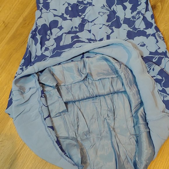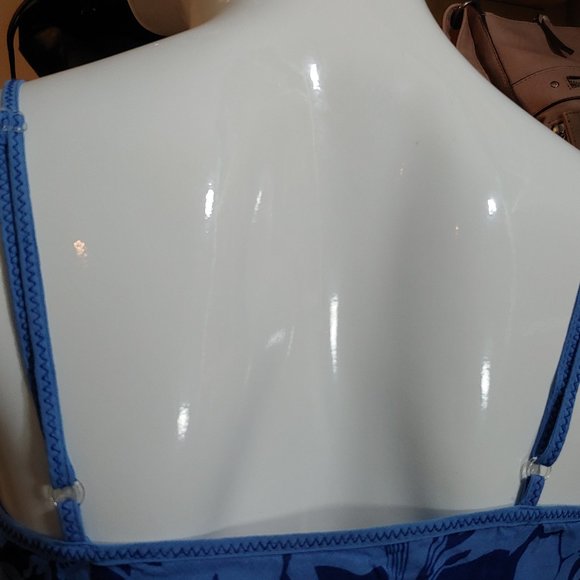 American Eagle in blue floral print in excellent used condition. Made in Korea. Minor discoloration on the armpit area but not visible unless you look really close. Side-zip on the right. Adjustable shoulder straps. V-shaped front style