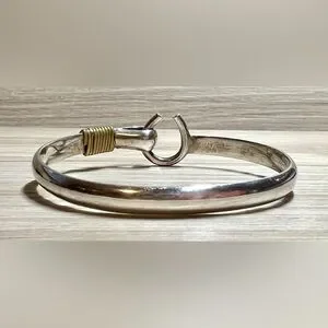 Embrace timeless elegance with the Vintage Designer Signed DK Sterling Silver & Brass Hook Bangle Bracelet. This exquisite piece features a classic oval shape and a practical hook closure, ensuring a secure fit for any occasion. Crafted from high-quality 925 sterling silver with a brass accent, this bangle exhibits a sophisticated two-tone finish that complements a variety of outfits, making it a versatile addition to your jewelry collection.