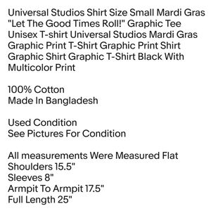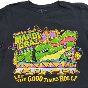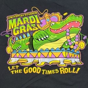 Universal Studios Shirt Size Small Mardi Gras "Let The Good Times Roll!" Graphic Tee Unisex T-shirt Universal Studios Mardi Gras Graphic Print T-Shirt Graphic Print Shirt Graphic Shirt Graphic T-Shirt Black With Multicolor Print
