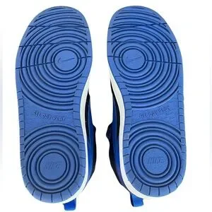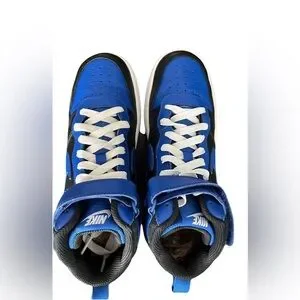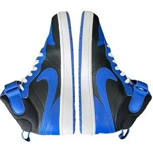 Blue and black. White shoe strings and logo.