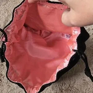 Elegant Chanel black drawstring bag with silk pink lining. Includes a sleek slip compact. Perfect for on-the-go. In very good pre-owned condition. Note, there are 2 light pen marks inside as pictured. Have not attempted to remove.