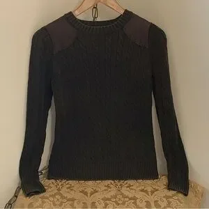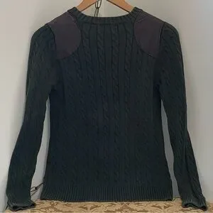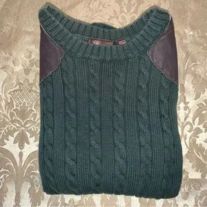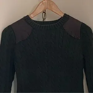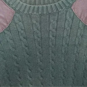 525 America Cable Knit Shoulder Patch Sweater. Hunter Green. A comfy and gorgeous cable knit with crew neck, dark brown leather shoulder patches, long sleeve, ribbed wrists and waist, 100% cotton and genuine leather patches. Gently used, very good condition, no snags, see pictures for details and wear.