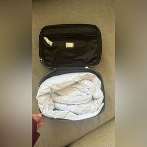 This makeup bag holds all your beauty essentials. It also keeps spills contained, in the event one happens. This bags features a carry handle, a zip closure, open interior area with 2 elastic pockets on each side and zip compartment top with middle zip pocket and 3 slip pockets (2 small for brushes, 1 large).