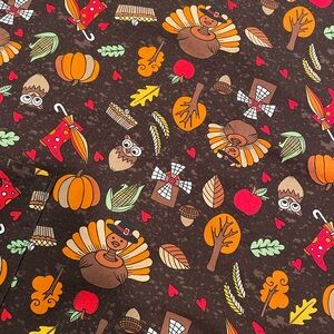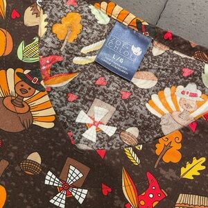Size large Zoe+Chloe women’s scrub top with Thanksgiving/harvest pattern.