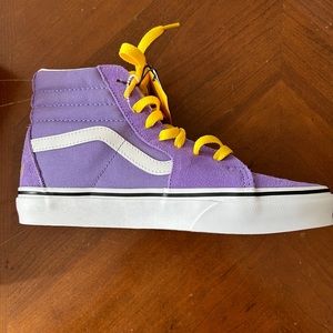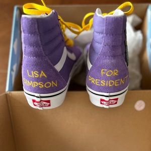Hey are you a fan of The Simpsons and love a good pair of limited edition hightop Vans? Then these Lisa Simpson Vans are for you. Purple Suede classic Hightop Skate Shoes with Lisa Simpson Patch and back embroidery.